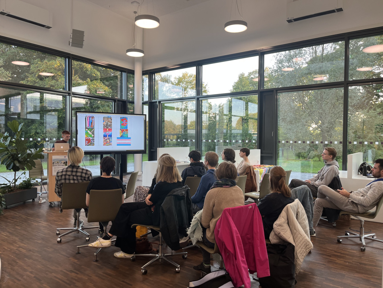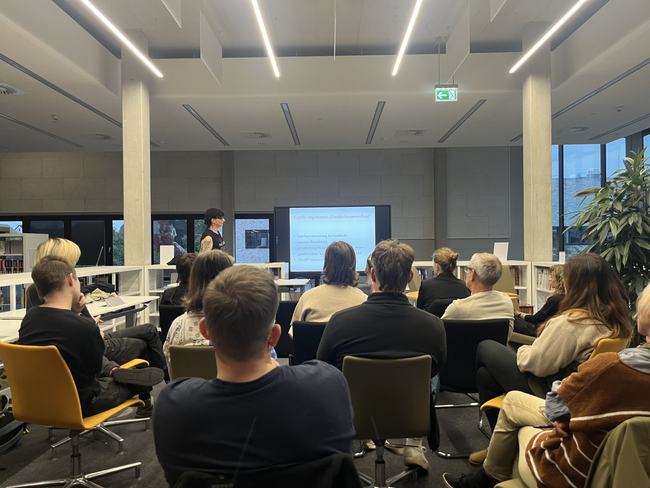 Der Veranstaltungsauftakt fand am Montag, 29. September in der Bibliothek am Campus Lippstadt statt. Unter dem Titel "Queerfeindlichkeit - Geschlecht, Diskriminierung, Solidarität" hielt Felicia Ewert, Politikwissenschaftlerin mit Schwerpunkt Geschlechterforschung einen Vortrag mit anschließender Diskussionsrunde. Am Mittwoch, 1. Oktober 2025 ging es dann auf dem Campus Hamm in der Bibliothek mit der Lesung "Trans Voice, QueerSelf: Zwischen Poesie und Bild" von Linn Schiffmann weiter. Jeweils rund 15-20 Personen lauschten den Beiträgen und die Bibliotheken boten mit ihrer entspannten Atmosphäre den perfekten Raum für einen Austausch mit und in der Community.