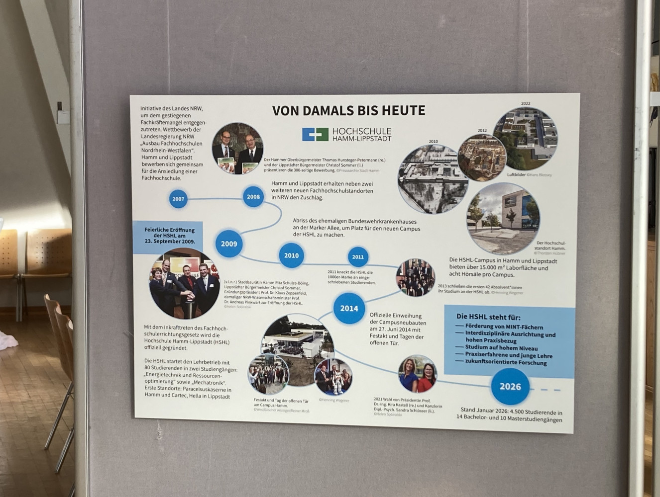 Darauf wird die Gründungsgeschichte der Hochschule mit dem Doppelcampus in Hamm und Lippstadt im Jahr 2009 vorgestellt und die Entwicklungen bis heute. Außerdem bekommen die Besucher*innen der Ausstellung einen interessanten Überblick über die wesentlichen Schwerpunkte der HSHL.