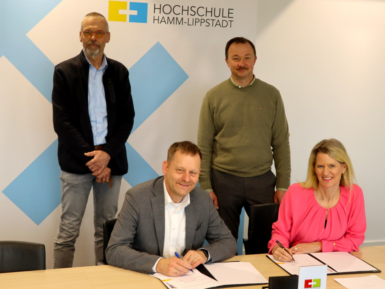 Am Mittwoch, 11. März 2026 wurde am Campus Hamm der Hochschule Hamm-Lippstadt (HSHL) eine Kooperationsvereinbarung zwischen der HSHL und der Stadtverwaltung über die Patenschaft einer Streuobstwiese in der Nähe des Beachvolleyballplatzes an der Friedensschule unterzeichnet. Dazu begrüßten Hochschulkanzlerin Sandra Schlösser und Prof. Dr. Christoph Harff, der als Initiator des Projekts dessen Leitung seitens der HSHL übernimmt, den Stadtbaurat der Stadt Hamm, Andreas Mentz, und Hartmut Sonderhüsken, Abteilungsleitung Grünflächen, am Campus an der Marker Allee.